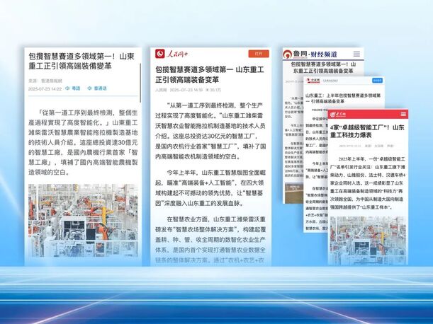 近日,人民網(wǎng)、大眾網(wǎng)、鳳凰網(wǎng)、中證網(wǎng)等各大媒體及行業(yè)媒體關(guān)注山東重工上半年包攬智慧賽道多領(lǐng)域第一,引領(lǐng)高端裝備產(chǎn)業(yè)變革,讓我們一起來看一下。