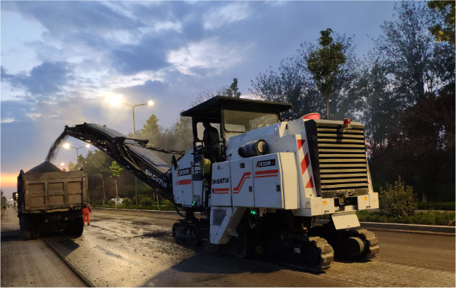 夕陽西下,華燈初上。G327國道路面翻新工程,5公分瀝青面層銑刨,行走速度可達20m/min左右。